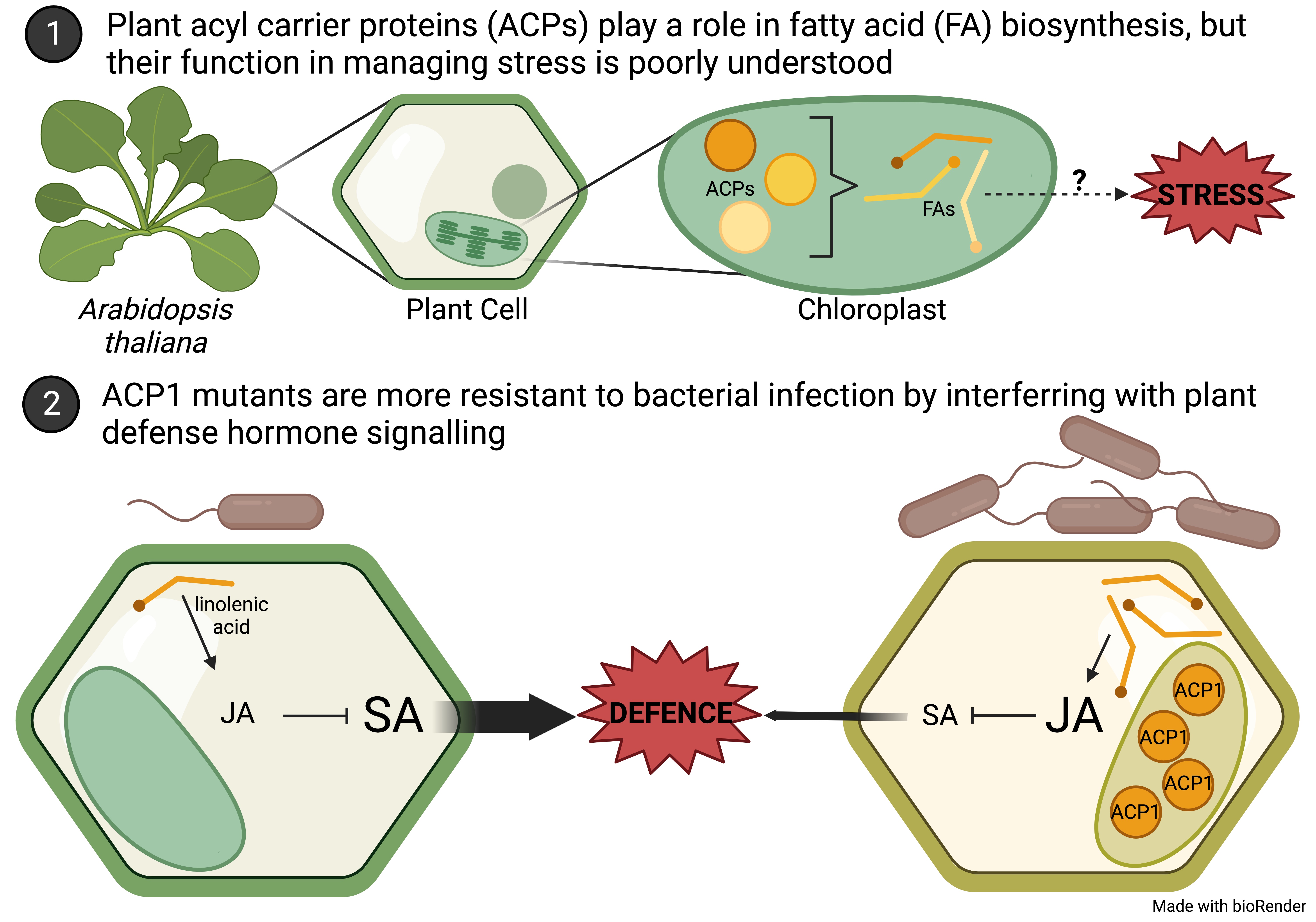 Plant fatty acids (FAs) serve as structural constituents of cell membranes and are building blocks for certain hormones, among other things. Fatty acids are stabilized during synthesis by acyl carrier proteins (ACPs ), found throughout all branches of life, which support and elongate the growing FA chains. A recent study, by Zhenzhen Zhao (of The Ohio State University) and colleagues, reveals a new dimension to the role of FA biosynthesis in plants by providing a direct
