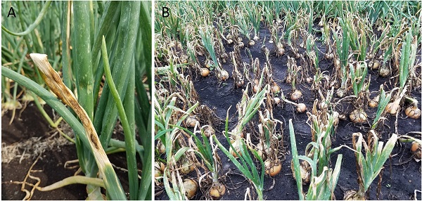 Stemphylium leaf blight (SLB) initially appears as small, tan to brown lesions that coalesce and extend the length of the leaves. These lesions become dark olive brown to black, contributing to the loss of green leaf area, which may affect bulb size and quality and prevents the plant tops from lodging naturally when the bulbs are fully matured.