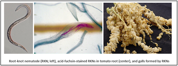 Root-knot nematodes (RKNs, Meloidogyne spp.) infect a broad range of plants, including several agriculturally important species such as cotton, soybean and corn, as well as various vegetables and ornamentals. These parasites cause roots to develop galls that result in severe plant damage and, ultimately, important crop losses. Growers currently use synthetic nematicides to manage RKNs; however, these compounds are detrimental to the microbial diversity of soil and harmful for the environment. Thus, it is necessary to develop alternative sustainable control methods.