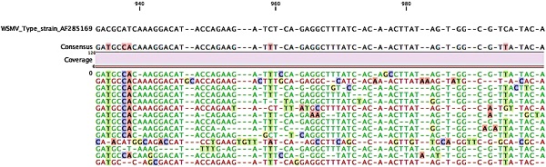 Illustration of the nucleotide variability within individual Oxford MinION sequencing reads from virus-infected wheat tissue cDNA against the genome of Wheat streak mosaic virus Type Strain (AF85169). Alignments are within nucleotides 932–996 of the WSMV genome.