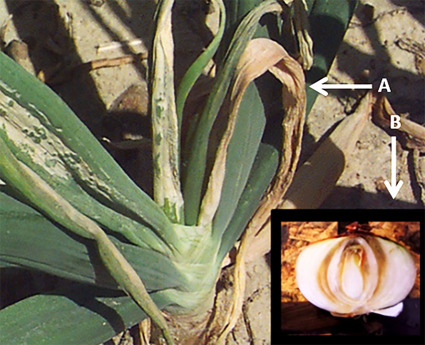 et al. 2013). Additionally, the authors observed that the specific bulb scale showing symptoms could be traced back to the corresponding infected blade (Fig. 1). Therefore, the authors concluded that protecting foliage of onion leaves can protect against bulb incidence of center rot.