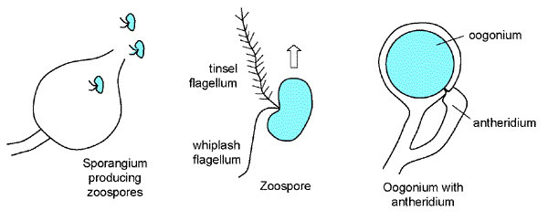 In addition the Oomycota produce motile zoospores with two kinds of flagella, one of which is a whiplash flagellum oriented posteriorly while the other is called a tinsel flagellum, which has a fibrous, ciliated structure and is oriented anteriorly (Figure 2). Behavior of zoospores of