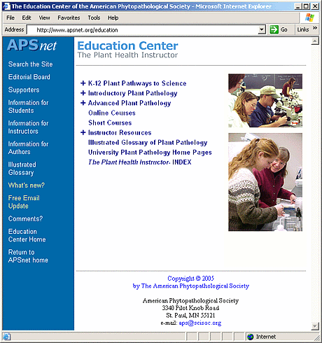A central site for plant pathology education. Although instructors may link directly to specific materials, students will find a variety of materials to enrich their study or as a source of ideas for papers or research projects.