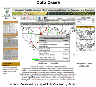 Fig. 5. Specialists are also able to enter and update narrative or location-specific commentary on the status of the legume crop, pest and disease reports and distributions, scouting and management tools and provide links to other resources such as crop and pest/disease models, pesticide recommendations (e.g., www.highplainsipm.org), and other IPM products. This site serves outreach needs, and is available for public access by producers, consultants or other interested parties. |