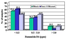 Based on surveys from the mid-1990s (Fig. 2), 0.5 percent to 10.5 percent of corn grown in the North Central US had fumonisin levels of 5 ppm or higher B1 (not including other fumonisins), which would be unsuitable for horses or human food use, according to FDA proposed guidelines (36,37,38,55,56). In order to understand the implications of these fumonisin levels in relation to FDA recommendations, it is important to consider the various uses of maize grain and how the FDA recommendations differ among those uses.