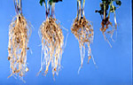 Currently, partial resistance is identified by challenging soybean lines with a single compatible (susceptible interaction) race to determine the amount of the soybean plant that is colonized. In greenhouse assays, approximately 30% of the roots are colonized by P. sojae in soybean cultivars with high levels of partial resistance. Soybean plant introductions with very high levels of partial resistance may contain other types of resistance that cannot be identified with these methods. There are reports from Ohio, Maryland and Australia in which races of P. sojae have adapted to cultivars which were believed to have high levels of partial resistance(<20% roots colonized), but were subsequently identified as single major genes expressed in the roots (McBlain et al., 1991; Ryley et al., 1998; Thomison et al., 1988; Thomison et al., 1991).