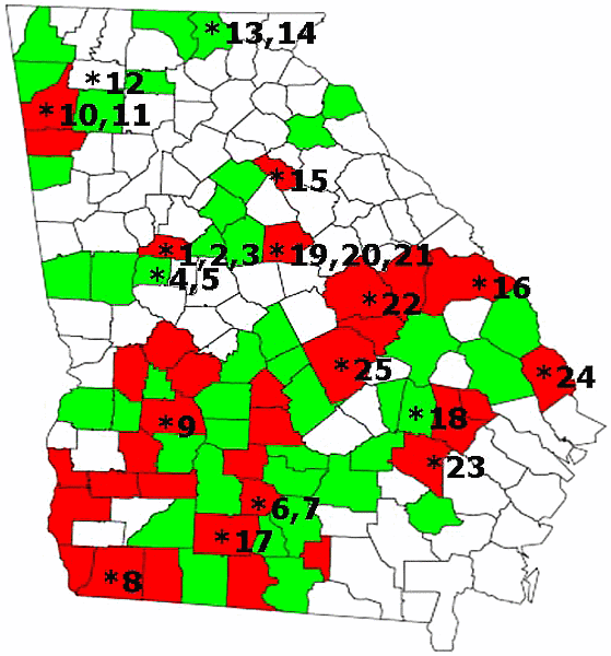 Fig. 5. Distribution of soybean rust positive counties (in red) and soybean rust negative counties (in green) in Georgia as of 3 November 2005. Numbered asterisks correspond to clover, kudzu or soybean sentinel plots. |