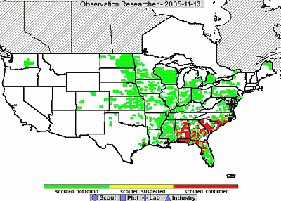 Fig. 6. Distribution of Asian soybean rust in the United States as of 13 November 2005. Photo available at www.sbrusa.net. |