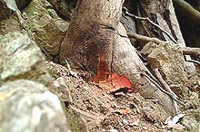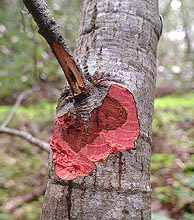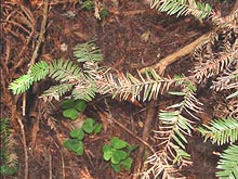 Symptoms on S. sempervirens are associated with saplings and basal sprouts on large trees. On saplings, P. ramorum causes discoloration of needles and cankers on small branches (Fig. 1), resulting in an overall decline in tree vigor. The pathogen was isolated from needles and small branches of 11 S. sempervirens saplings (2 to 15 cm diameter) at two locations (Jack London State Park, Sonoma Co. and Henry Cowell State Park, Santa Cruz Co.). Distinct purple-colored lesions have been observed on sprouts in the field and apparently lead to death of the shoots. P. ramorum was detected using the PCR diagnostic test from 12 of 90 symptomatic basal sprouts collected at 7 locations spanning the known geographic range of P. ramorum in coastal California. While it appears that P. ramorum may be relatively abundant at these sites on S. sempervirens, these results also indicate that other causes of sprout mortality may be occurring. Greenhouse inoculations of S. sempervirens stems and leaves caused similar lesions as observed in the field (Tables 2 and 3). In addition, extensive xylem discoloration was noted in sapling inoculations.
