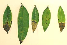 For most experiments, three genetically different isolates of P. ramorum from three different hosts were used. Foliage inoculations were conducted by misting leaves with sterile distilled water (SDW) and then pinning inoculum plugs to the upper surface of leaves. Sterile agar plugs were used as controls. A zip-loc plastic bag was then placed over the individual leaves; prior to sealing the bag the leaves were misted again with SDW. Each trial generally consisted of 10 leaves coming from 5 different plants per host species per isolate, plus controls. In all trials, seedlings were incubated for 2 weeks in a greenhouse that was maintained at 20 to 24°C. For each trial, symptoms were recorded, lesion length and width was measured and pieces of stems or leaves were plated on PARP to verify presence or absence of P. ramorum.