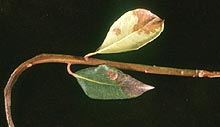 Across the range of known hosts, we can distinguish two different types of diseases: non-lethal foliar and twig infections, and lethal branch or stem infections. Foliar infections play a key role in the epidemiology of P. ramorum by serving as a source of inoculum which is then spread aerially through rainsplash (1). The most likely dispersal propagules of P. ramorum, sporangia and chlamydospores, are readily produced on foliage (particularly of U. californica and Rhododendron spp.), but we have yet to find them on infected oak bark. Therefore, P. ramorum epidemics in California oak forests may be driven by the presence and susceptibility of associated plant hosts, not the oaks themselves. Two recent studies have reported a significant association between the presence of U. californica trees and P. ramorum infection on Quercus spp. (8,14) and our preliminary studies indicate that foliar host infection may precede infection of Quercus spp. and L. densiflora on a site. We hypothesize that P. ramorum may need to produce inoculum on the leaves of these associated hosts to serve as a springboard to oak species. Hosts with relatively small lesions may be especially important in the transmission biology of P. ramorum because such lesions do not kill leaves but can support abundant sporulation for extended periods of time.