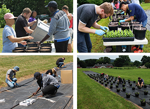Figure 2. At the plot setup day, students work in teams to mix inoculum into potting media (top L), plant and label pretreated cuttings (top R), set up irrigation lines (bottom L), and set up the final field design (bottom R).