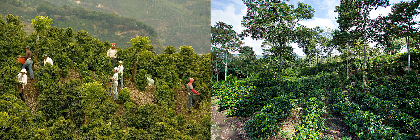 Figure 2. Harvesting coffee in the highlands of Tarrazú, Costa Rica (left), and coffee plantation intercropped with shade trees (right). (Photo credits: tastepuravida.com [left]; dailycoffeenews.com [right])