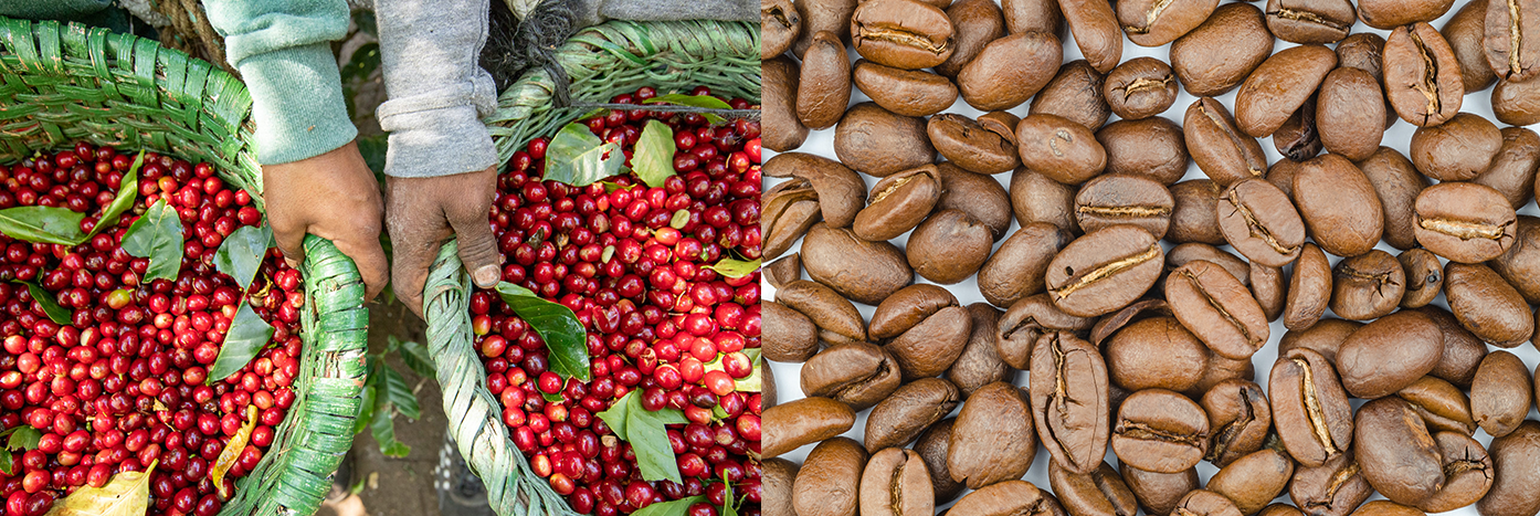 Figure 3. Hand-picked ripe coffee "cherries" (the fruit that contain the coffee beans) (left) and roasted coffee beans (right). (Photo credits: