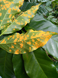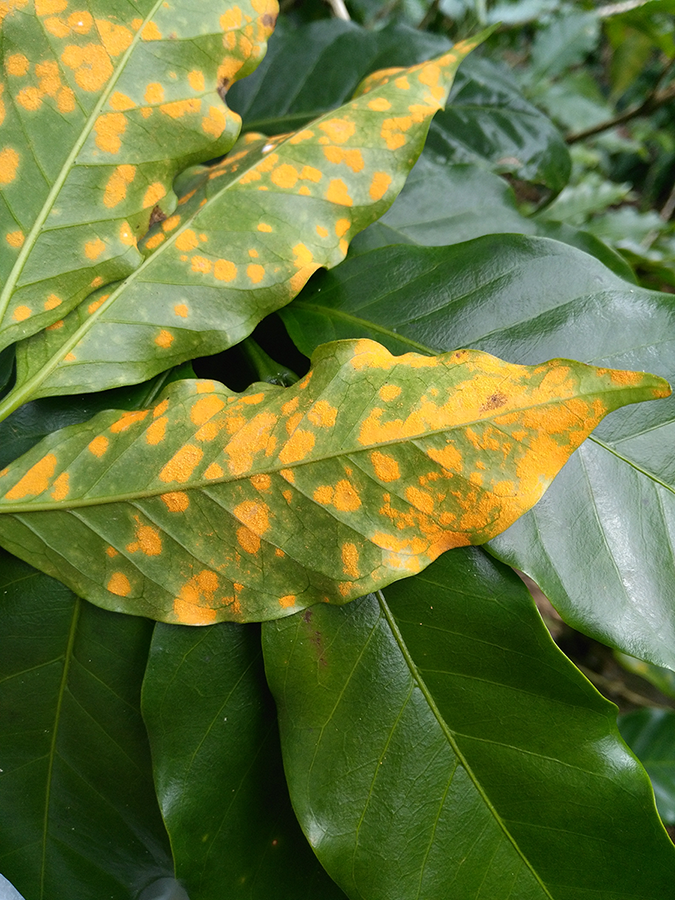 Hemileia vastatrix infection. The spots are composed of thousands of tiny, orange-colored rust spores. (Photo credit: Plant Pathology Department, ICAFE)