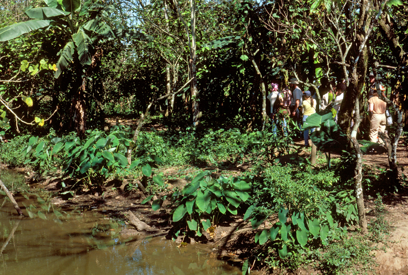 C14.13. Taro (Colocasia esculenta), also called dasheen (large leaves near the ground), growing at the edge of a cacao plantation. |