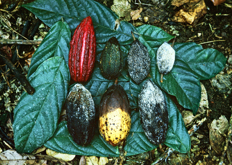 | C14.15. Black pod rot of cacao (Phytophthora species), showing healthy and diseased pods on the same tree. |