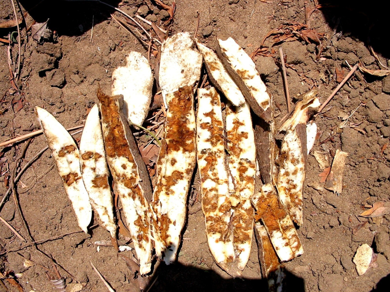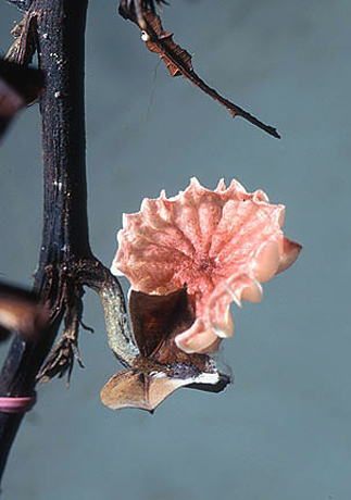 C14.16. Fruiting bodies of the witches' broom fungus (Crinipellis perniciosa) on a cacao branch and fruit. |