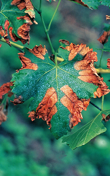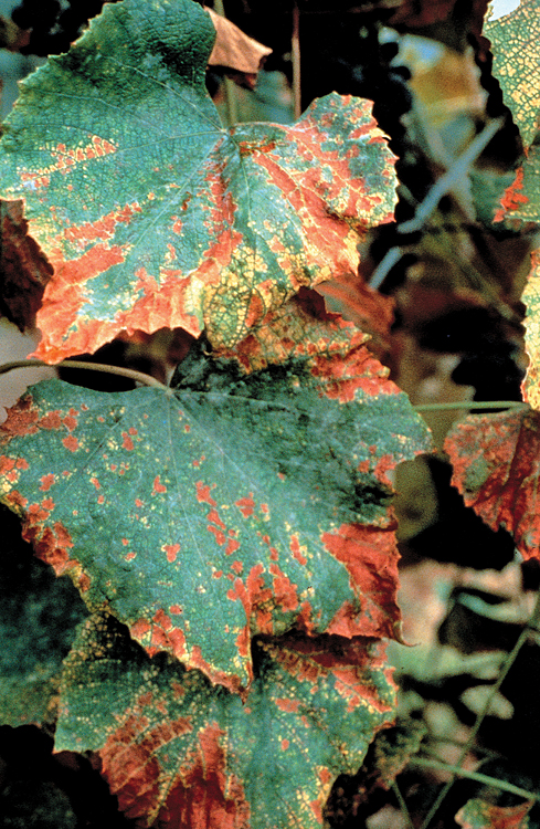 | C14.6. Marginal and interveinal chlorosis and necrosis on grape leaves caused by sulfur dioxide. |
