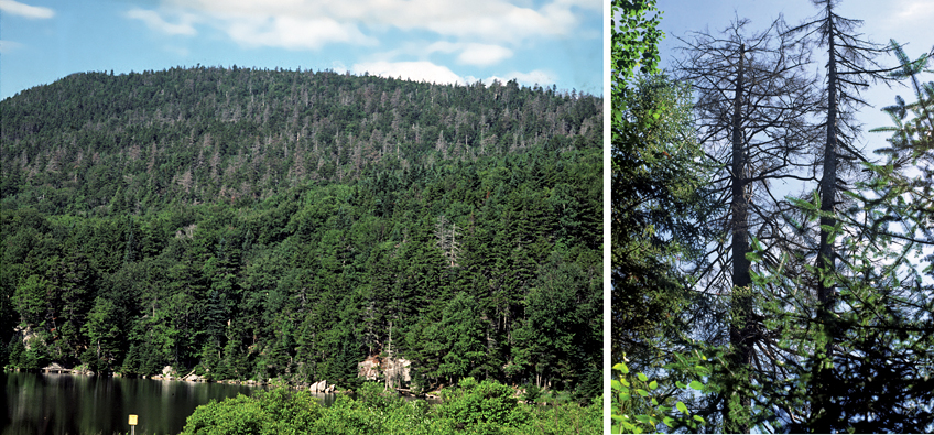 | C14.8. Forest decline of red spruce. A, Red spruce mortality, Crawford Notch, White Mountain National Forest, New Hampshire. B, Dead red spruce, Santanoni Peak, Adirondack Park, New York. |