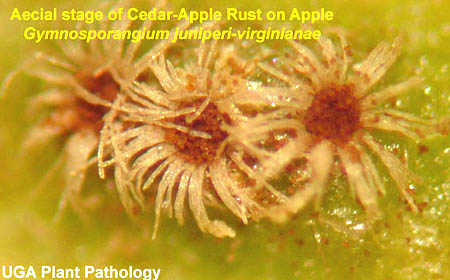 Views: Cedar-apple rust. This is a common fungal disease of red cedars (junipers) and apples (and crabapples) in North America and Europe. Cedar-apple rust is caused by a rust fungus that requires two hosts, apples and cedars, to complete its entire life cycle. In the spring, jelly-like orange horns form on small galls on the cedars and produce spores that can infect apples. Click image for an larger view, more information