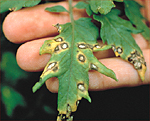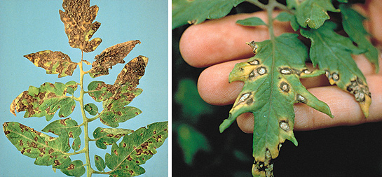 Views: One of the most common diseases of tomato is leaf spot. This disease is caused by a fungus called Septoria lycopersici and it can be devastating to commercial producers as well as homeowners. Click image for an enlarged view and more information. |