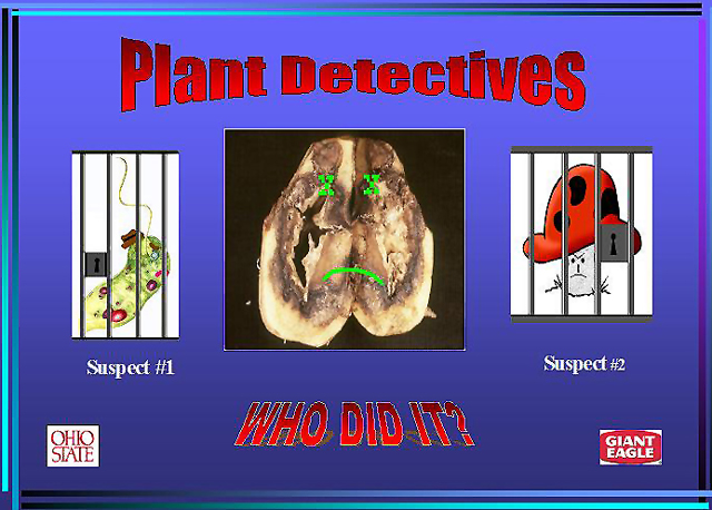 On the first day, we put on a skit involving three characters: the Manager and Assistant Manager of a grocery store (Giant Eagle) and the "Plant Detectives." The Assistant Manager noticed that many of the potatoes had sunken, black spots and smelled very bad. He alerted the Manager who called in the "Plant Detectives." The Plant Detectives asked questions such as where the potatoes came from and how they were shipped to Giant Eagle. They then explained how the "Disease Triangle" could be used to solve this mystery.