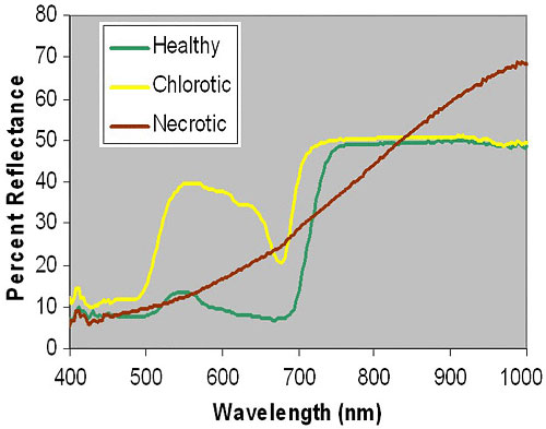 green light, it is reflected and gives healthy leaves their characteristic green color. Near-infrared light is reflected by the spongy cell structure inside of leaves. Chlorotic (yellow) leaves have lower levels of chlorophyll. This may be due to disease or lack of nutrients. Since they do not have much chlorophyll to absorb red and blue light, these leaves reflect more red, blue, and green light than healthy leaves giving them a yellow appearance. Necrotic leaves are leaves that are dead and have turned brown. They do not have pigments or the spongy cell structure of living leaves. Notice how both healthy and chlorotic leaves reflect near-infrared light in Fig.3, but have lower reflection around 700 nanometers. This is known as the “Red Edge” and is characteristic of living leaf tissue.