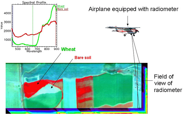 During World War I and World War II, the military was actively developing methods to take photographs from airplanes. Aerial photography has been a very useful surveillance method that is relatively safe for personnel. The military developed cameras that were specially designed for aerial imaging over large areas. They also developed special films that were sensitive to infrared light (wavelengths just beyond the range of human sight). During World War II, the military developed camouflage film, also known as color infrared film. This is a color film where green things appear blue, red things appear green, and things that reflect infrared light appear red. With this film, vegetation has a characteristic bright red appearance. Camouflage does not reflect infrared light as well as natural vegetation so it appears blue in color infrared film. During World War II, many soldiers were exposed to this technology. After returning home, they developed many uses for it in agriculture. When camouflage film (color infrared film) is used to take pictures of cropland or forests, it is very easy to identify areas where plants are not growing as well as other areas. This is due to differences in their reflectance (Fig. 2).Healthy leaves reflect green (500 to 600 nanometers) and infrared light (700 nanometers and above) but not blue (400 to 500 nanometers) or red light (600 to 700 nanometers) (Fig. 3). Chlorophyll, the pigment used in photosynthesis, absorbs red and blue light and uses the energy to convert carbon dioxide into plant sugars. Since chlorophyll does not use