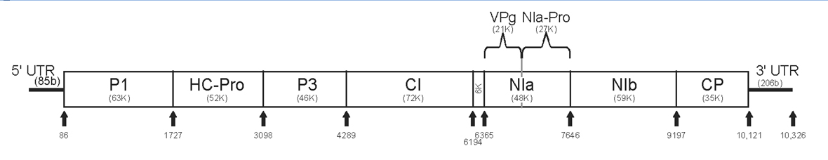 The virus particle or virion consists of a nucleocapsid, a filamentous flexuous rod measuring roughly 760-800 x 12 nm (Figure 3). Virus particles typically contain 94.5% protein and 5.5% nucleic acid by weight, and have no outer membrane (non-enveloped). The buoyant density of the purified virions is 1.32 g cm-3 in cesium chloride. The thermal inactivation point (TIP) of PRSV is 54-60°C and the longevity in vitro (LIV) is about 0.3 days. The first complete PRSV genome sequence was obtained from a PRSV isolate from Hawaii (PRSV HA). Like other potyviruses, PRSV has a monopartite linear single-stranded positive sense RNA genome and is about 10,326 nucleotides long, excluding a poly-A-tract found at its 3’ end. Typical of potyviruses, the PRSV genome encodes a single large protein, (in the case of PRSV, 3,344 amino acids) which is subsequently cleaved into smaller proteins with various functions. The cleaved proteins are: P1, HC-Pro, P3, CI, 6K, NIa-Pro, NIb and CP (Figure 4). The different functional proteins are formed by a series of site-specific cleavage events carried out by three virus-encoded proteases, P1, HC-Pro, and NIa. The possible functions of the PRSV genome encoded proteins have been deduced from various potyvirus studies and are listed in Figure 4.