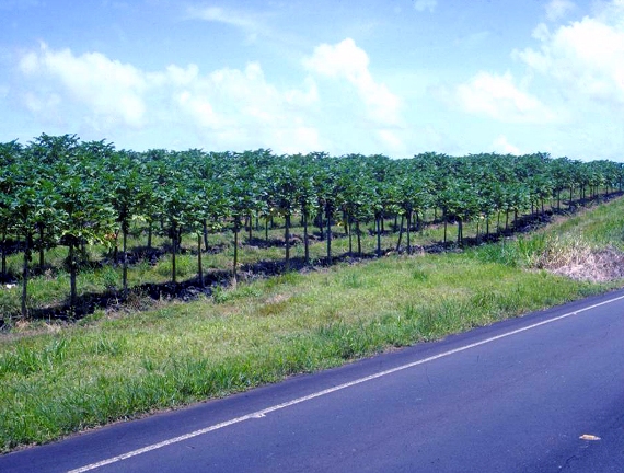 The state of Hawaii includes seven inhabited islands (Hawaii, Maui, Oahu, Kauai, Molokai, Lanai, and Niihau) isolated by miles of ocean. It is, thus, buffered from continual influx of PRSV from other geographic regions. PRSV was discovered on the island of Oahu in the 1940s where Hawaii’s papaya industry was located. In the 1950s, PRSV caused severe damage to papaya orchards on Oahu, and thus papaya production was relocated to the Puna district on the island of Hawaii in the early 1960s. In Puna, the industry enjoyed many years of papaya production in the absence of PRSV. However, PRSV was detected and became established in Hilo on the island of Hawaii in the late 1960s. Other factors in addition to geographic isolation played key roles in keeping PRSV out of Puna since Hilo was only 19 miles away. The other factors included continually surveying and rogueing of PRS-affected papaya in Hilo, activities that helped to lower the incidence of PRSV in the Hilo area, a quarantine on the movement of papaya seedlings into Puna, and surveillance for PRS in the Puna district where by the 1970s, 95% of the state of Hawaii’s papaya were being produced. Thus, a combination of avoidance, geographical isolation, rogueing, use of quarantine to keep infected seedlings from being transported to Puna, and constant efforts to detect and eliminate infected trees all contributed to keeping the Puna district free of PRSV.