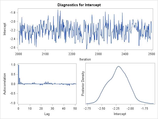 Below are three examples of important diagnostic plots automatically produced by GENMOD (and by other procedures in SAS) (Fig. 4, 5 and 6). These three plots are produced for each parameter in the model. Results for the intercept parameter is shown in Fig. 4 and 5. In each figure there are 3 sub-plots: trace plot, autocorrelation plot and posterior density plot. In Fig. 4, the first plot is the trace plot, a sequential graph of all the MCMC samples in the chain. Note that the first sample starts at 2000 because the burn-in was 2000 (default). There are then another 10,000 samples generated. The trace plot in Fig. 4 is the ideal that one should be looking forward for. There is no trend, and the values jump randomly above and below the central value. The autocorrelation plot shows the serial correlation of each sample in the chain with the previous samples; lag 1 is for each sample with the previous one, lag 2 is for each sample with the one two samples previously, and so on. At lag 0, the autocorrelation is 1, by definition, but is shown to provide perspective in interpretation. In Fig. 4, the lag 1 correlation is very close to 0, and the remaining correlations are even closer to 0. This is ideal. Finally, the posterior density plot is an estimate of the posterior distribution based on the 10,000 samples used from the trace plot (Fig. 4). A kernel smoothing algorithm is applied to the values to produce the curve. This posterior density is the ultimate goal of the Bayesian analysis. Summary statistics are derived from the samples that comprise the empirical density, such as the mean, median, standard deviation, and so on (see examples, below).