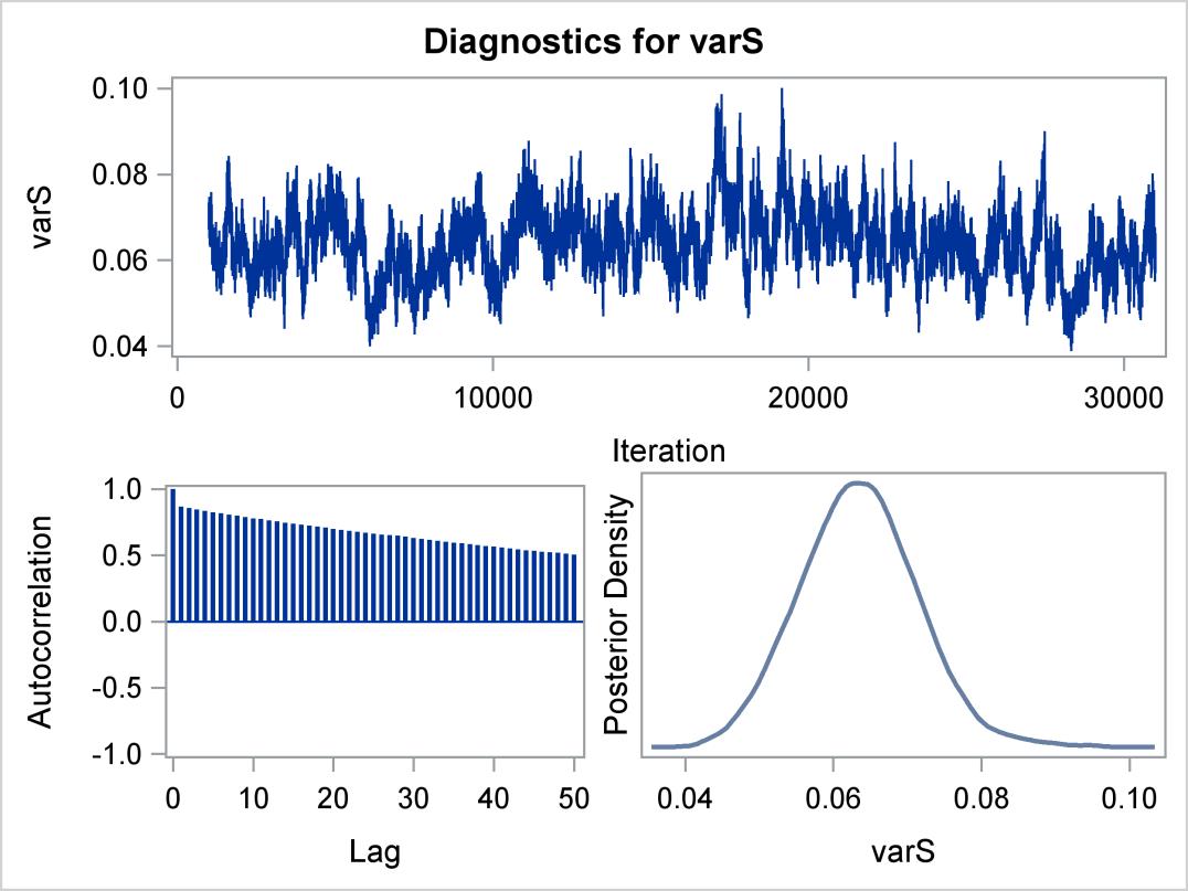 Figure 6 is an example of very poor mixing in the MCMC chain. This is an example from a nested model (with multiple random effects) fitted by PROC MCMC (beyond the scope of this article). The autocorrelations are high and decline very slowly. The trace plot shows very slow movement of the parameter values above and below the central value. This is a totally unacceptable sampling, and these results cannot be used since they indicate a poor model.