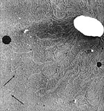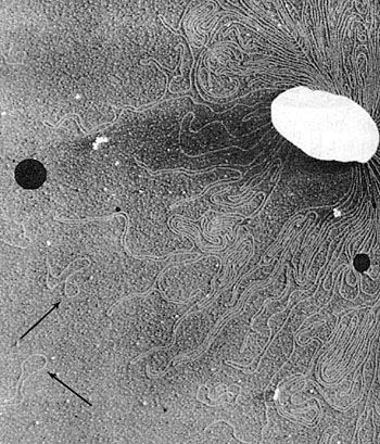 Figure 4. Release of chromosomal and plasmid (arrows) DNA from an unidentified bacterium. (Courtesy H. Potter and D. Dressler, from Brock Biology of Microorganisms, 9th edition, used by permission of M. T. Madigan). Click image to see a larger vie. |