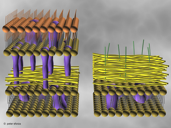 Figure 5. Diagrams of the cell wall structure of Gram-negative (left) and Gram-positive bacteria. (Used by permission of P. Sforza). Click image to see a larger view. |