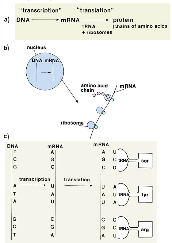 Figure 2. The translation of a deoxyribonucleic acid (DNA) genetic message into a protein. Ribonucleic acid (RNA) differs from DNA in having ribose sugar units rather than deoxyribose and uracil (U) rather than thymine (T) as a nucleotide base. a. Overview of transcription using one strand of DNA to messenger RNA (mRNA) and translation to a chain of amino acids (protein) with the help of transfer RNAs (tRNAs). b. After transcription from DNA, mRNA leaves the nucleus and moves to the cytoplasm in eukaryotes. tRNAs carry amino acids and “match” with a triplet codon on the mRNA to create a chain of amino acids in the order coded for in the DNA. c. Diagrammatic view of transcription and translation. Nucleotide bases: C=cytosine, G=guanine, A=adenine. Amino acids: ser=serine, tyr=tyrosine, arg=arginine. (Courtesy G. Schumann). Click image to see a larger view. |