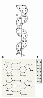 Figure 1. The double helix. a. Deoxyribonucleic acid (DNA) is a double-stranded, helical molecule composed of nucleotide units. Replication of DNA occurs through the pairing of nucleotide bases to form new strands. b. Diagram of the molecular structure of the base pairs of DNA. “Sugar” indicates the bond to deoxyribose. Phosphates connect the sugars to make the “backbone” of DNA. A nitrogen base plus deoxyribose and a phosphate group constitutes a nucleotide. Adenine (A) always pairs with thymine (T), and cytosine (C) always pairs with guanine (G). c. Diagram showing pairing of the nucleotide bases in a short DNA segment. (Courtesy G.L. Schumann). Click image to see a larger view. |
