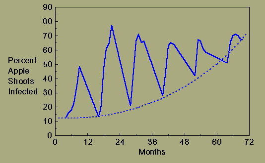 Apple powdery mildew is an example of a polyetic epidemic caused by a polycyclic pathogen. Note how the incidence of infection at the start of each year tends to increase exponentially.