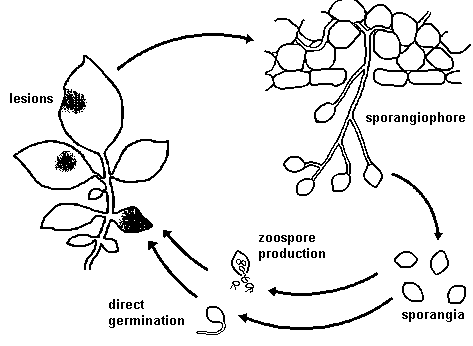 In order for an epidemic to be considered polycyclic, there must be repeated complete infection cycles, that is, infection followed by pathogen development, new inoculum production, dispersal to new susceptible sites, and new infections, all within a single crop cycle. A good example is potato late blight, where a single cycle of infection, lesion development, sporulation, sporangium dispersal, and new infection can occur in as little as five days, and many overlapping cycles occur simultaneously during periods of favorable weather.