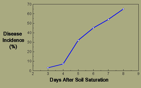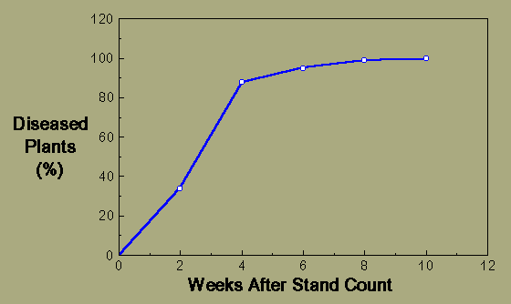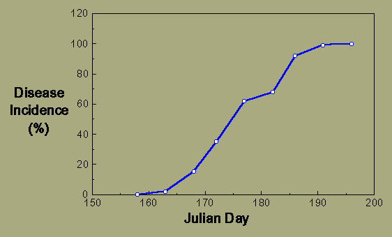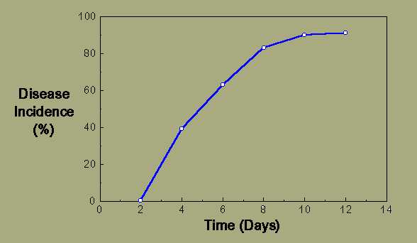 Disease on plants usually starts out at a low level, a small number of plants affected and a small amount of plant tissue affected, and it becomes of concern to us only when its incidence and severity increases with time. When we look at some examples of plant disease epidemics from the published literature, we not only notice that the incidence or severity starts near zero and then increases dramatically, but we also can discern some distinct patterns of development with time. For example, in Phytophthora blight of pepper seedlings (