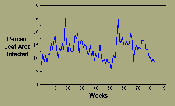 Sigatoka leaf spot on bananas decreases somewhat during the dry season but otherwise produces more or less continuously repeated cycles of infection. The host, in this case, consists of a population of plants of different ages developing continuously over a long period of time. |