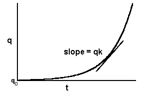 This, we see, is the familiar exponential function, where q0 is the initial inoculum, and e is the base of the natural (Napierian) logarithm. The instantaneous rate of change in q is dq/dt, the slope of the tangent to the curve at any point.