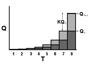 We solve this equation repetitively, changing the subscript T, indicating time, with each successive season and making the current value of QT+1 the value of QT in the subsequent season. In order to simplify the equation, we assume a constant K (an average over many seasons). The above equation gives the following graph: