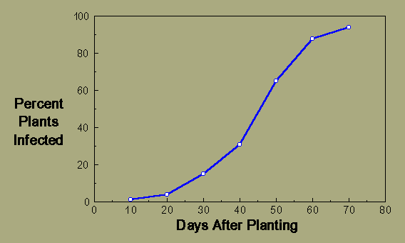 Example 1, a monocyclic epidemic: Flax wilt is caused by the fungus Fusarium oxysporum f. sp. lini. Chlamydospores of the fungus persist for several years in the soil, and when flax is planted in an infested field, the young plants are infected through the roots. An extensive soil survey was made of a heavily infested field, and it was found to contain an average of 57 colony-forming units per gram of soil. When a susceptible flax cultivar was planted in this field, the percent of plants showing wilt symptoms increased with time as follows: