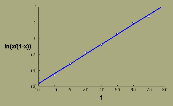 By plotting ln(x/(1-x)), sometimes called the logits of x, versus t, we can fit a straight line to the data points with least squares regression.