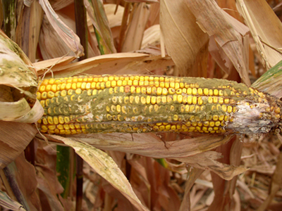 Aflatoxin contamination is economically important in crops such as maize, peanuts, cottonseed, and tree nuts. Aspergillus flavus is commonly associated with a disease of maize known as Aspergillus ear rot [Figure 3]. Powdery, grey-green spores may develop on the surface of maize ears, and aflatoxins may be produced by the fungus until the kernel moisture reaches about 15 percent. High temperatures, drought stress, and insect injury may contribute to increased aflatoxin contamination in maize. Aspergillus flavus and A. parasiticus may cause a disease of peanuts known as yellow mold [Figure 4], and high levels of aflatoxin contamination may result following relatively high temperatures and moderate humidity. Cottonseed, an important food source for dairy cattle, may become contaminated with aflatoxins if the seed-bearing capsules (bolls) are damaged, followed by high humidity and warm temperatures before or after harvest. Tree nuts such as pistachios and almonds may become contaminated with aflatoxins during injury, such as the splitting of hulls.
