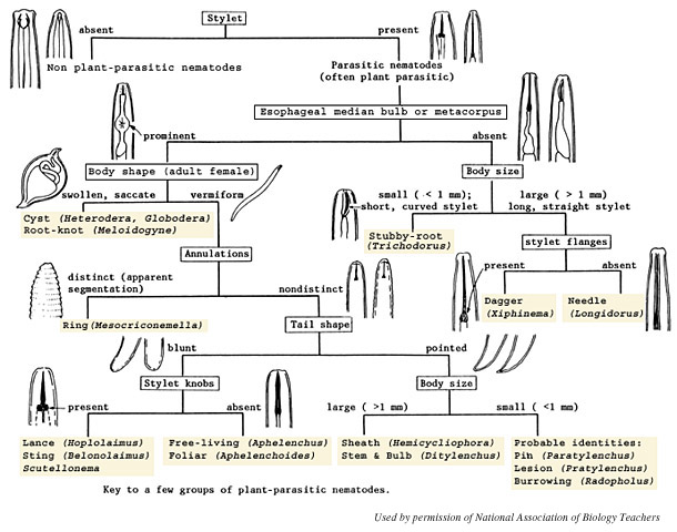 Plant-parasitic nematodes generally are classified as ectoparasites or endoparasites based on the position of the nematode body in relation to the plant being fed upon. Identification of nematodes to genus requires observation of overall body shape, size, and length, stylet length and morphology, structure of the esophagus, tail shape, cuticle markings, etc. See Figure 7 and listed websites for details and additional keys.