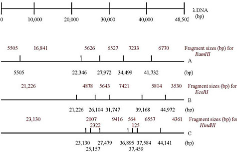 This figure shows the size of each of the fragments/bands produced when λ DNA is cut with each of these restriction enzymes. The sizes were determined by comparison to a molecular ladder which has bands of known sizes when it is separated by electrophoresis at the same time as the digested λ DNA.