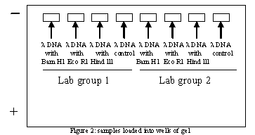 Following staining to locate the DNA, the gel is observed and the fragments appear as a pattern of bands. In this experiment, we will compare our banding pattern with a predicted result shown in figure 1.