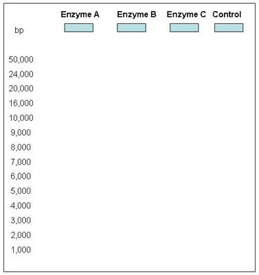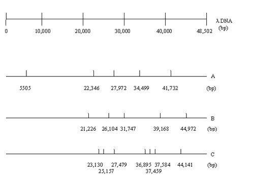 The sites at which each of the 3 different enzymes will cut lambda DNA are shown in the maps Enzymes A, B and C below.